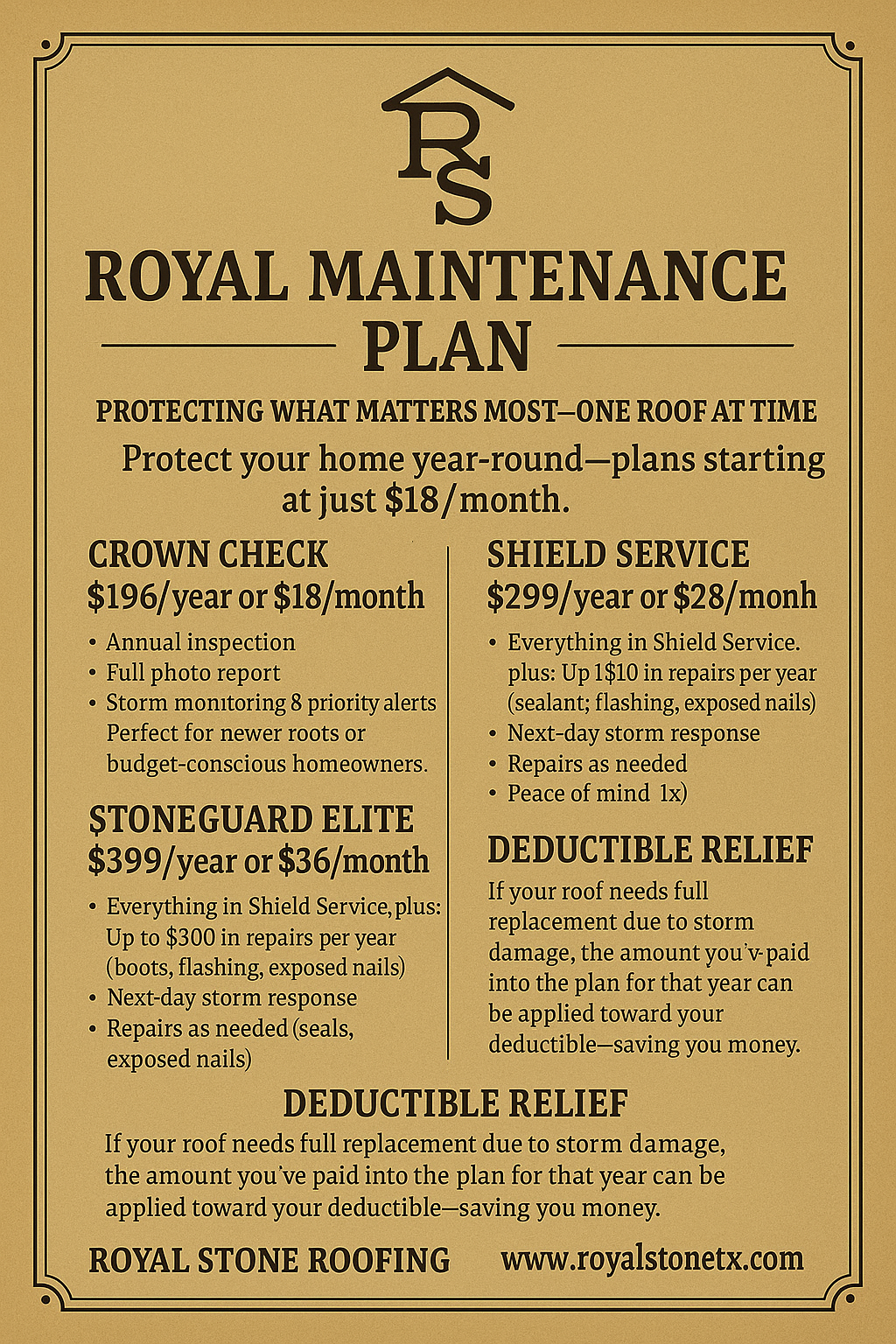 Categories: Select a Category New Construction Roof Roof Repair Full Roof Replacement Store New Construction Roof | Roof Repair | Full Roof Replacement | Royal Stone Maintenance Plan $0.00 Add To Cart Added! Royal Stone Roofing Gear $30.00 Add To Cart Added! Premium Roofing Solutions $8,000.00 Add To Cart Added! Full Roof Replacement - Limited Time $500 Off Sale Price: $8,495.00 Original Price: $8,995.00 Sale Add To Cart Added!